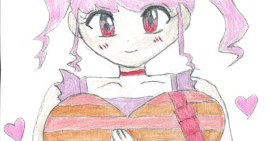 バレンタインデーをテーマにして描きました。おっきなハートのチョコレートにリボンでラッピングしたのを渡そうとしている女の...