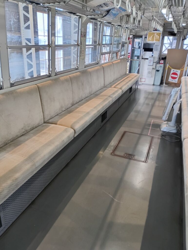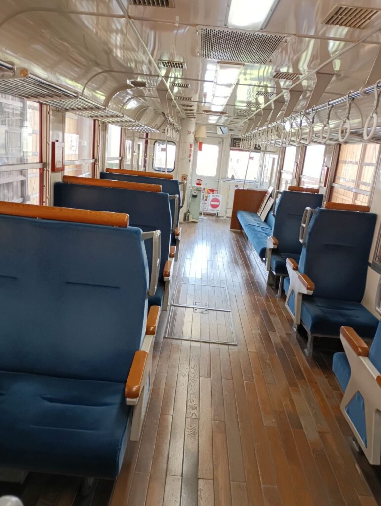 車内はロングシート。揺れが凄いのできつかったw私もこれに乗ったことあるので。