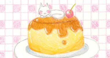 今回はプリンの上でお昼寝をするねこちゃんを描いてみました。 白い猫ちゃんはホイップクリームをイメージして...