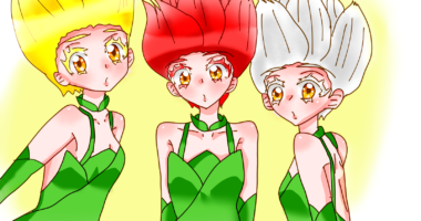 赤・黄色・白の三色のチューリップの擬人化を描いてみました!ドレスはチューリップの葉っぱで、髪型はチューリップの...