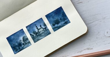 作品詳細 透明水彩の小さな夜-3頁 星月夜と教会 ・ホルベイン 透明水彩絵...