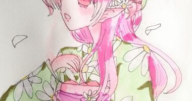水彩毛筆で花柄の袴を着た大和撫子なエルフの女の子を塗って描いてみました。 ...
