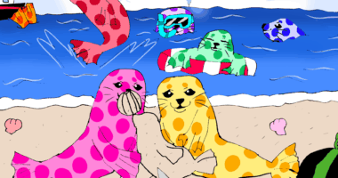 色んな色のドット柄のアザラシ達が楽しく海水浴をしている様子を描いてみました。 ...
