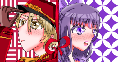 大正時代の紫色の髪の女学生とブロンズカラーの髪の車掌さんの男性がお互い意識をしている感じに描いてみました。真ん...