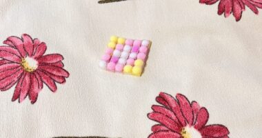 材料: 100円ショップの四角ビーズ カラフルポンポン 両面テープ ...