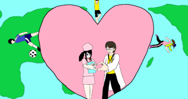 お医者さんと看護師さんがそれぞれ手を合わせてハートマークを作り、愛と結束力をアピール。二人を囲むハートマークの後ろには...