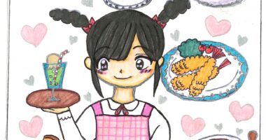 お料理が大好きな女の子と美味しい食べ物を描きました。自分が好きな食べ物を想像しながら描いてたので、お腹が空きそ...