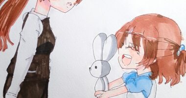 今の自分が過去の自分に出会う瞬間を描いてみました!!持っているウサギのぬいぐるみは、女性の幼いころからの宝物で...