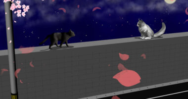 春の展示会のイラストを投稿しました。お題は『出会い』とのことでしたので、夜桜と猫ちゃんたちの出会いにしました。...
