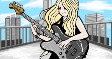 こんにちは。TOSHIです。 今回はベースを弾く女性のイラストを描きました。 小柄な女性と無骨なベ...