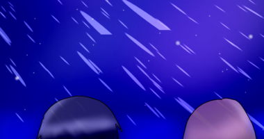 アイビスペイントの雨フィルターを使ってたくさんの流れ星を表現してみました。二人のカップルが山頂から流れ星を見上...