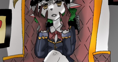アイビスペイントでヤギの擬人化の女の子を描いてみました。自惚れるような表情と足を組む座るポーズとゴシックな感じ...