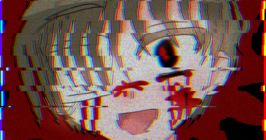 サイコパスな男の子をアイビスペイントのグリッチフィルターやブラウン管ノイズの背景素材を使って、ホラーっぽく描い...